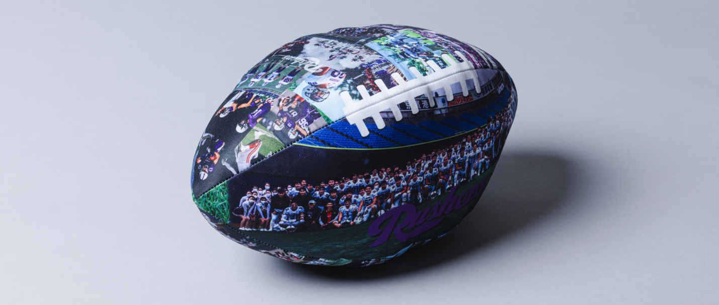 思い出の写真を全面プリントした アメフトボール型のオーダークッション