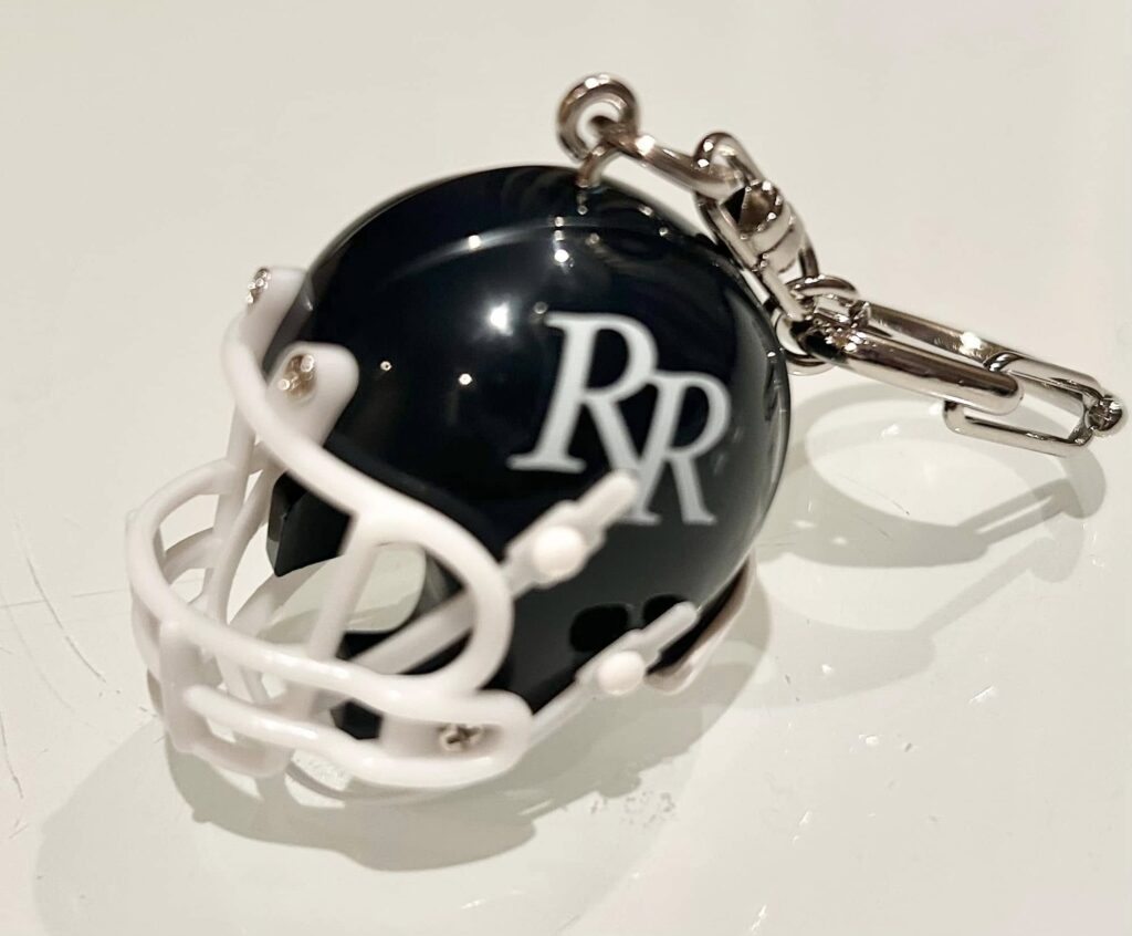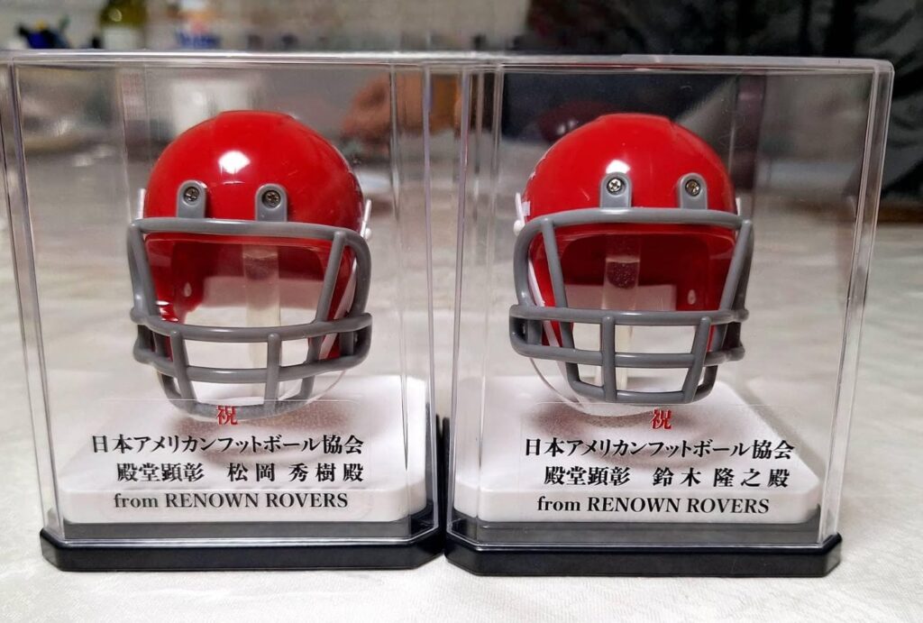 日本アメリカンフットボール協会殿堂顕彰記念品は全くの通常のミニヘルメットキーホルダーの約2倍サイズの特別仕様品です。プラスチックケース入りの贈答品としても使えます。